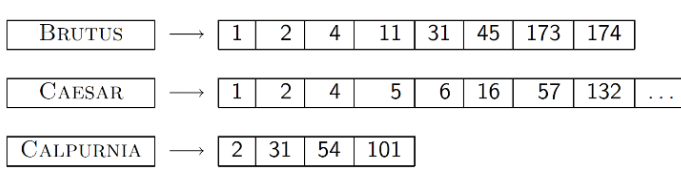 - 오른쪽의 숫자는 해당 term이 존재하는 docID를 오름차순으로 정렬해둔 것으로 postings라고 부름.