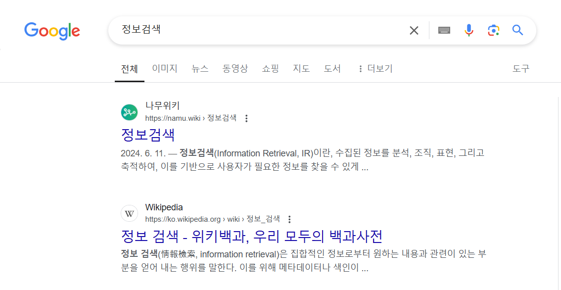 여기서 저 아래에 뜨는 <정보검색....이란, 수집된...>과 <정보 검색... 은 집합적인...>이 snippet이다.