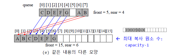 3) 첫번째 부분(queue[0]~queue[rear]사이의 원소들)을 capacity-front-1에서부터 복사해 넣음