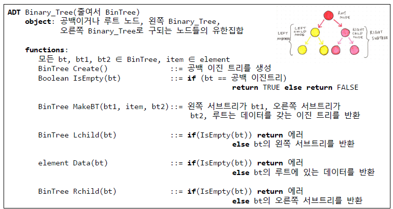 - 루트와 왼쪽 서브트리, 오른쪽 서브트리 두 개의 분리된 이진 트리로 구성된 노드의 유한 집합