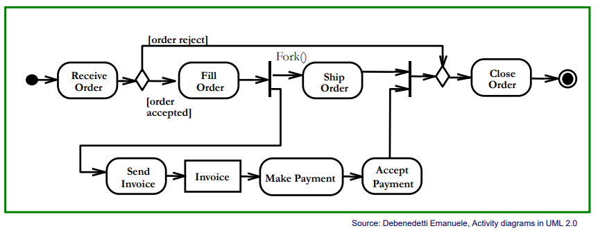 - 노드는 Action Node/Control node(Decision, Fork, Join, Activity와 Flow final)/Object Node(Pins)로 구분됨