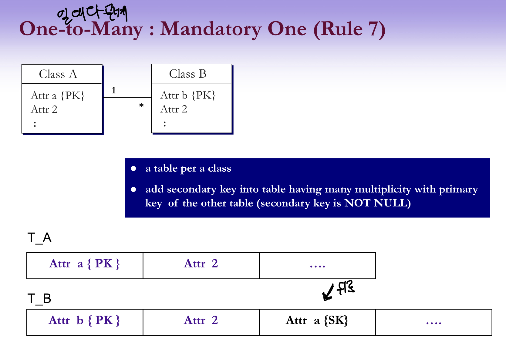 - 클래스 다이어그램의 관계를 DB 테이블 스키마로 변형
