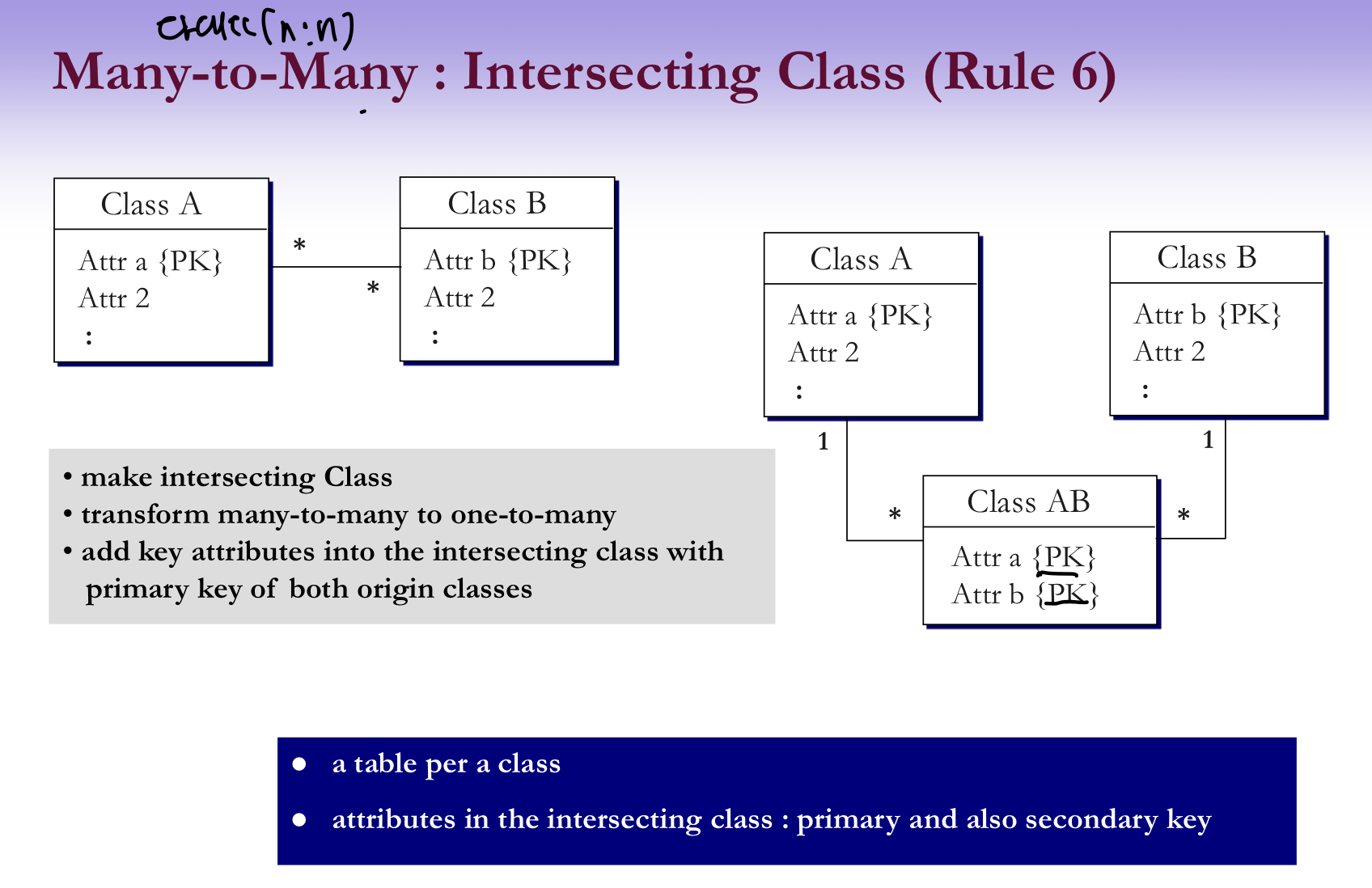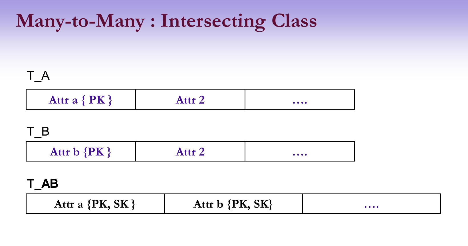 - multi-valued aggregation/association 관계는 새로운 associative 테이블에 매핑.-테이블은 두개의 원래 테이블에 같이 관계됨. Primary 키를 본 테이블에서 새로운 assocative 테이블로 복제.
