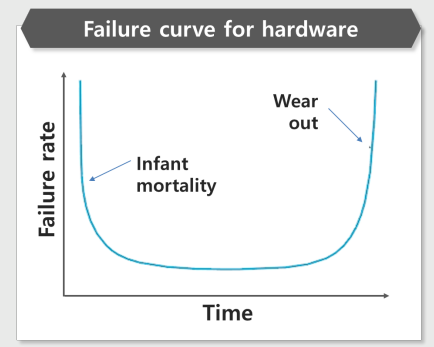 하드웨어는 초기에 높은 실패율을 보이고, 안정되었다가, 시간이 지나면 노화와 환경에 의해 고장이 늘어나게 된다.